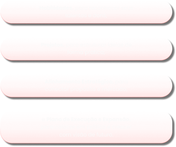 Para mulheres que já sabem qual projeto querem desenvolver e buscam estratégia, clareza e acompanhamento individual por mais tempo para estruturar e colocar em prática comigo segurando sua mão.